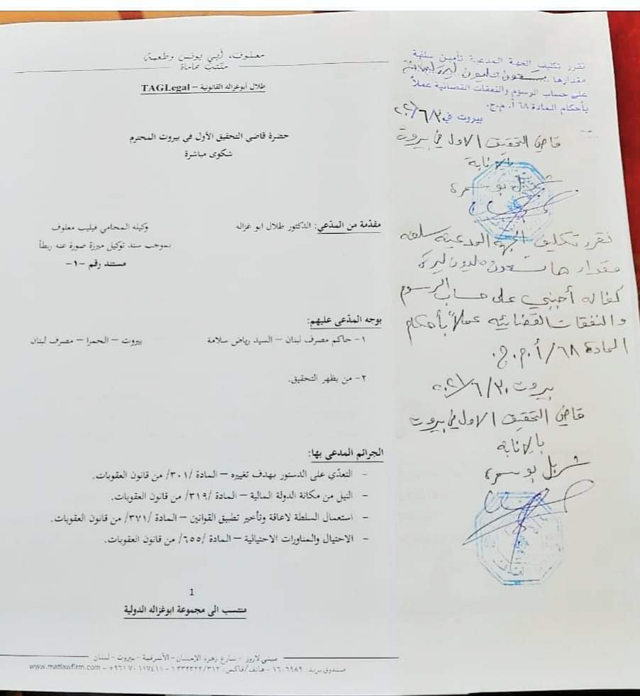 أبو غزالة قدم شكوى مباشرة ضد رياض سلامة