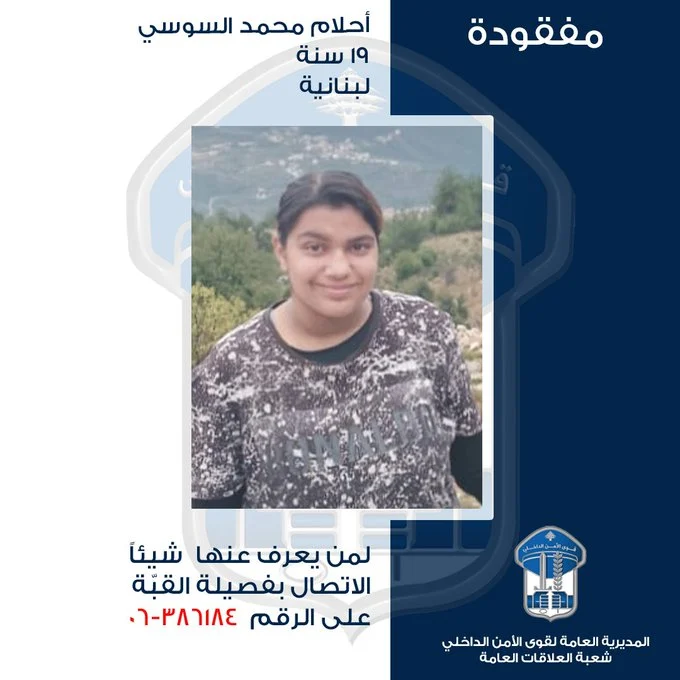 الاحداث - عمّمت المديريّة العامّة لقوى الأمن الدّاخلي بناءً على إشارة القضاء المختص، صورة المفقودة أحلام محمد السوسي (مواليد عام 2006، لبنانيّة)، التي غادرت حوالى الساعة 15،00 من تاريخ 24-11-2025 منزل جدّتها الكائن في القبة- شارع الجديد، إلى جهة مجهولة، ولم تَعُد لغاية تاريخه.