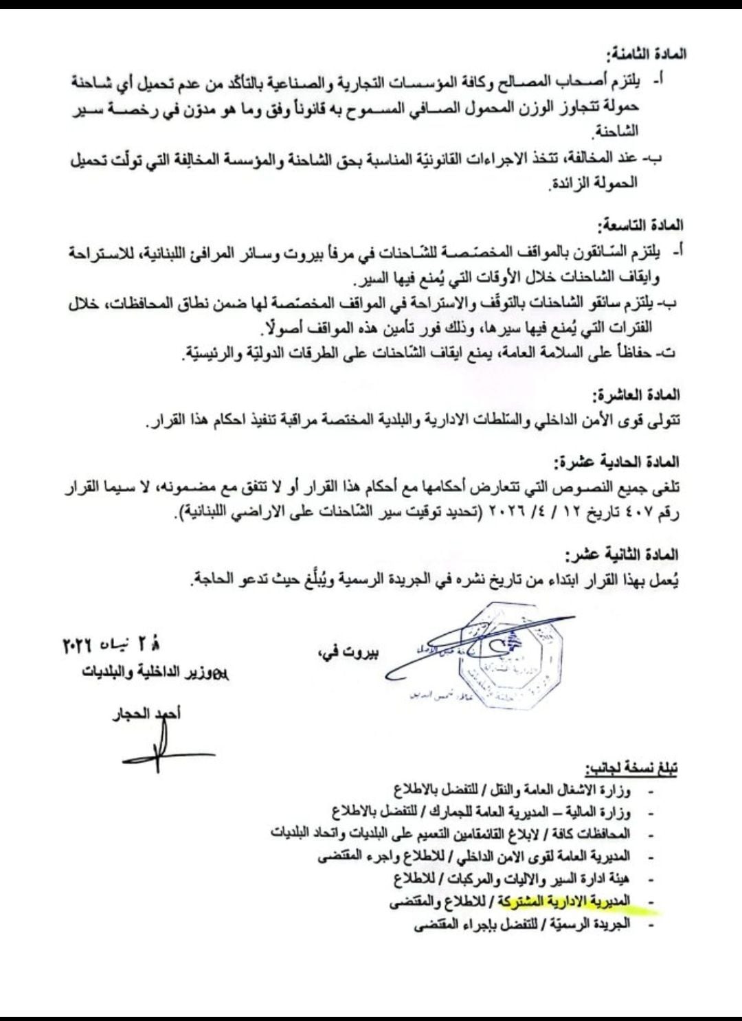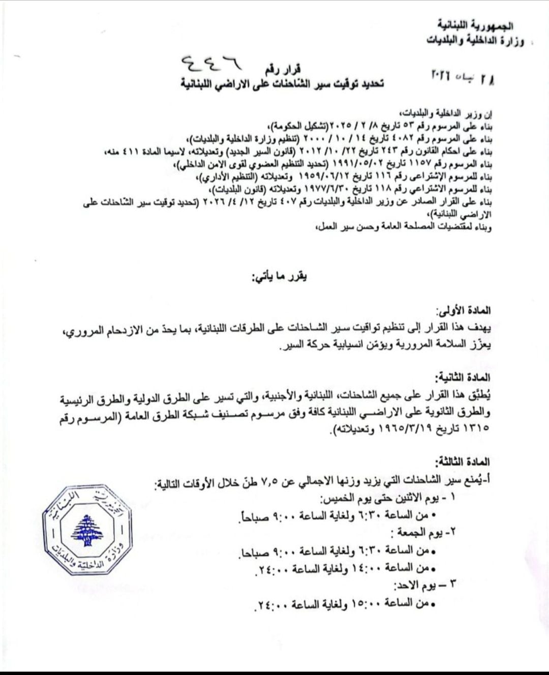 عممت وزارة الداخلية والبلديات القرار رقم 446 تاريخ 28/4/2026 حول تعديل توقيت سير الشاحنات على الأراضي اللبنانية.