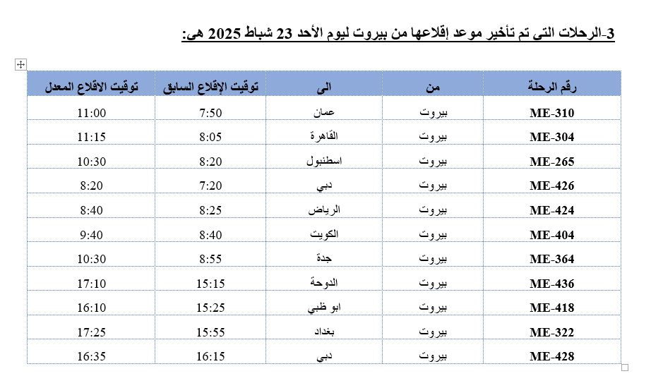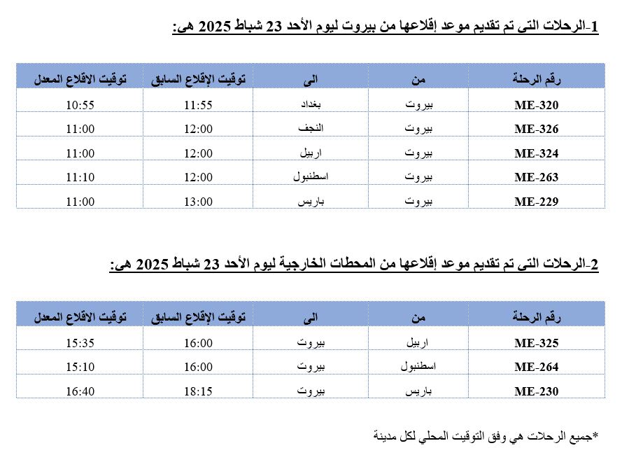الأحداث- أعلنت شركة طيران الشرق الأوسط - الخطوط الجوية اللبنانية أنها سوف تسير جميع رحلاتها ليوم الأحد الواقع فيه 23 شباط/فبراير 2025 مع بعض التعديلات في مواعيد إقلاع وهبوط الطائرات بسبب تعليق حركة الطيران في مطار رفيق الحريري الدولي بتاريخ 23 شباط ابتداءً من الساعة الثانية عشر ظهراً ولغاية الساعة الرابعة من بعد ظهر اليوم نفسه.