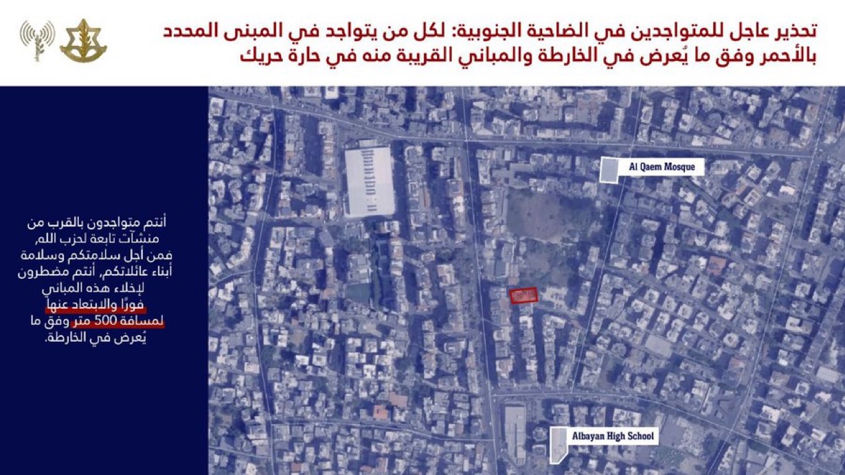 الأحداث - كتب المتحدث بإسم الجيش الإسرائيلي أفيخاي أدرعي على منصة إكس: “إلى جميع السكان المتواجدين في منطقة الضاحية الجنوبية وتحديدًا في المبنى المحدد في الخارطة المرفقة وتلك المجاورة لها في حارة حريك”.