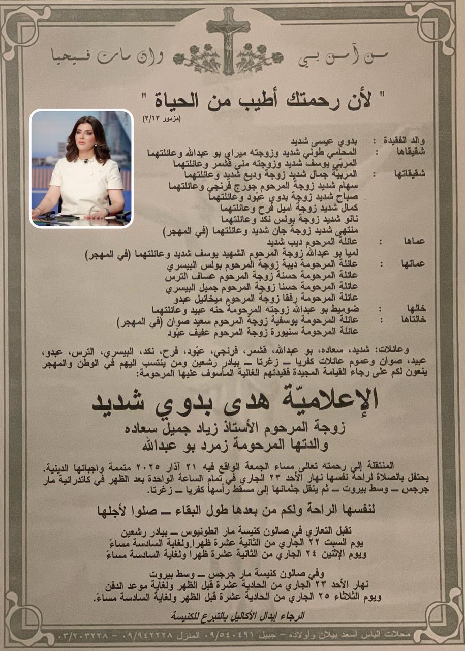الاحداث- يودع الاعلام اللبناني وأسرة المؤسسة اللبنانية للارسال وعائلة شديد الزميلة هدى شديد في مأتم رسمي مهيب يوم الاحد المقبل، حيث سيحتفل بالصلاة لراحة نفسها عند الأولى من بعد الظهر في كاتدرائية مار جرجس - وسط ببروت . ثم ينقل جشمانها الى مسقط رأسها كفريا - زغرتا.