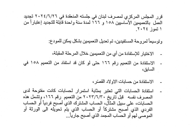 الأحداث - قرر المجلس المركزي لمصرف لبنان تجديد العمل بالتعميمين الأساسيين 158 و166 لمدة سنة واحدة قابلة للتجديد اعتبارا من 1 تموز 2024.