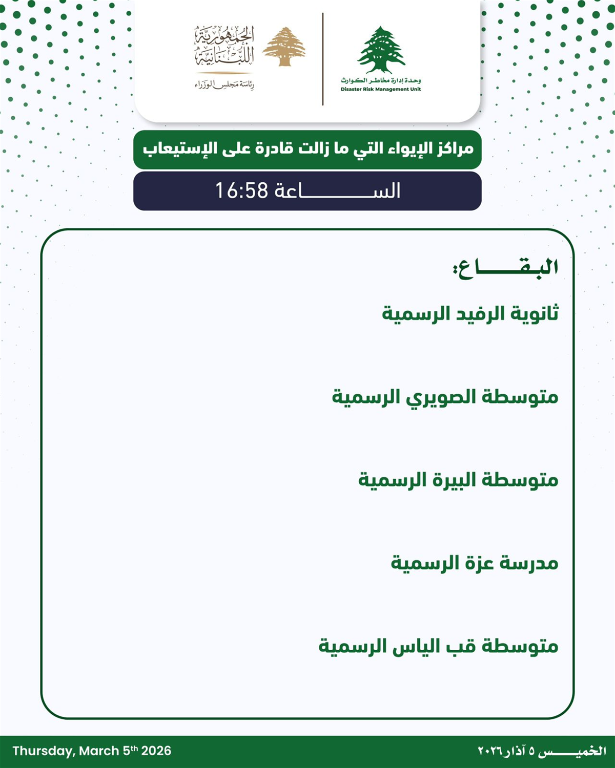 الأحداث تتابعون في الصور المرفقة، مراكز ايواء النازحين التي ما زالت قادرة على الاستيعاب.
