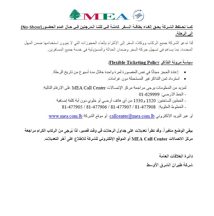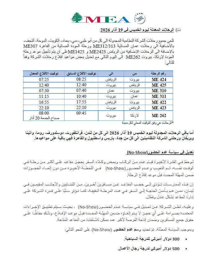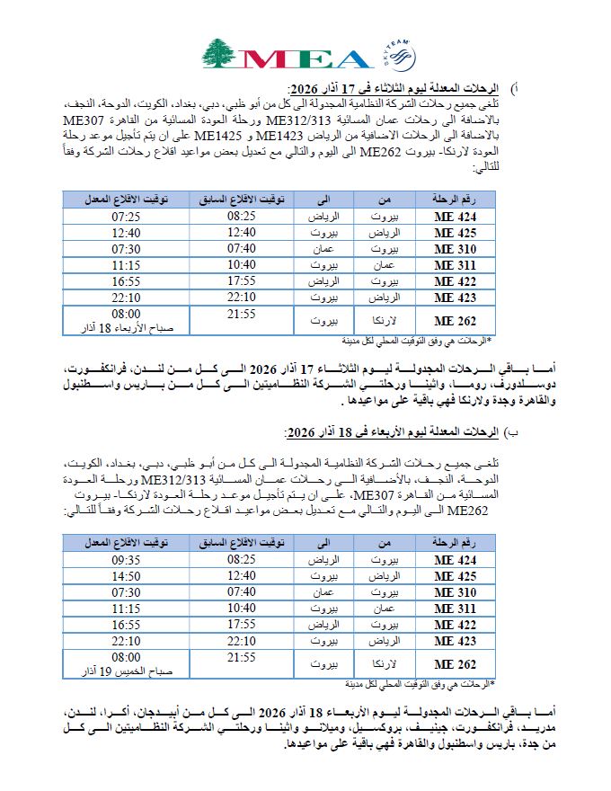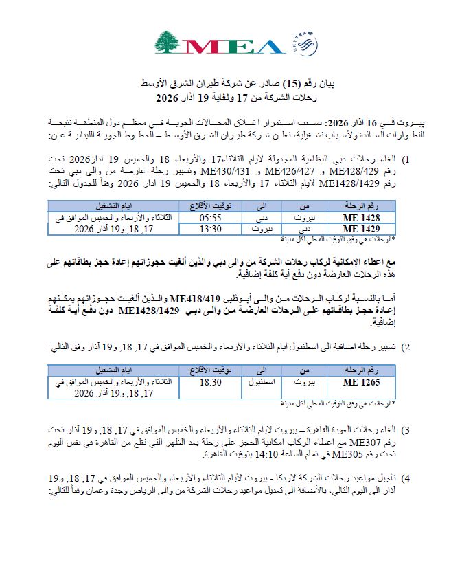 الأحداث - أعلنت شركة طيران الشرق الأوسط – الخطوط الجوية اللبنانية رقم (15) أنه بسبب استمرار إغلاق المجالات الجوية في معظم دول المنطقة نتيجة التطورات السائدة، ولأسباب تشغيلية، تقرّر إلغاء عدد من الرحلات النظامية بين بيروت ودبي المقررة بين 17 و19 آذار 2026.