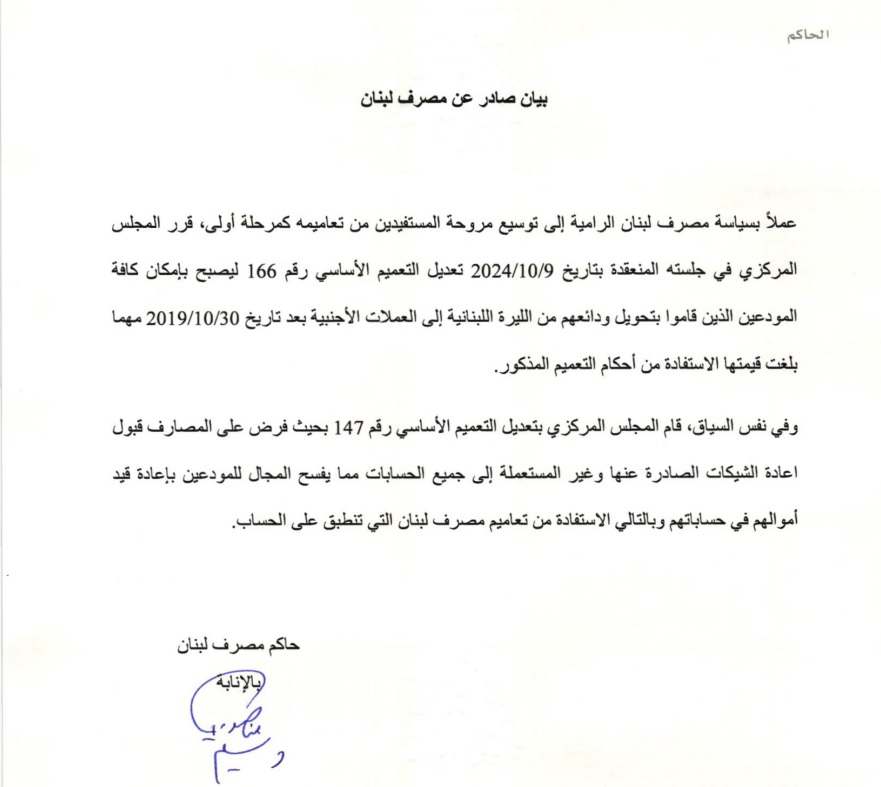 الاحداث - تعميم جديد لمصرف لبنان وهذا ما جاء فيه: