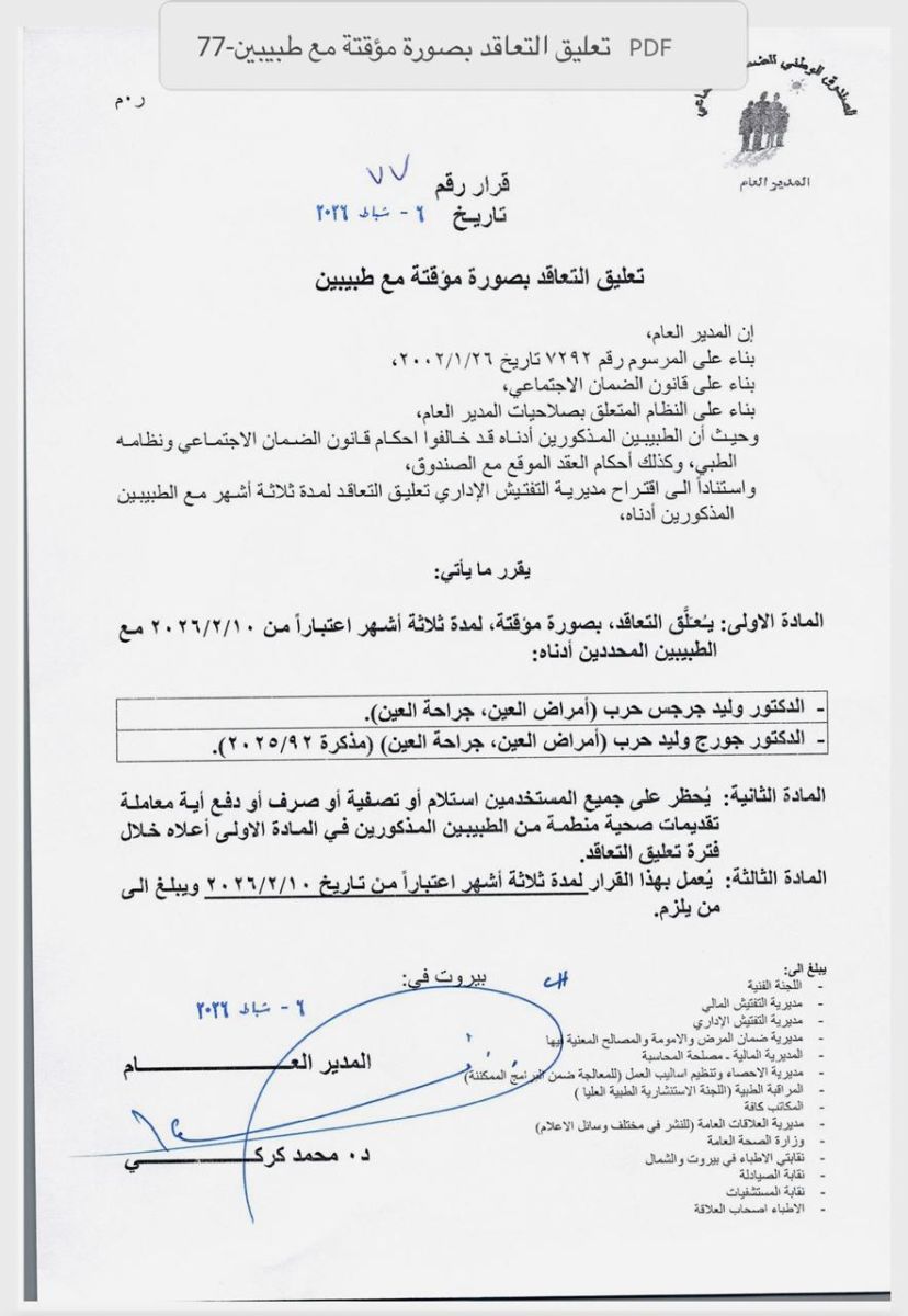 الاحداث- أوقف المدير العام للصندوق الوطني للضمان الاجتماعي الدكتور محمد كركي، اليوم الثلاثاء، العمل بقراري تعليق التعاقد الصادرَين بتاريخ 6 شباط 2026 مع طبيبَي أمراض وجراحة العين د. وليد جرجس حرب والدكتور جورج وليد حرب، ومع مستشفى تنورين الحكومي، وأعاد التعاقد معهم اعتباراً من 25 شباط 2026.