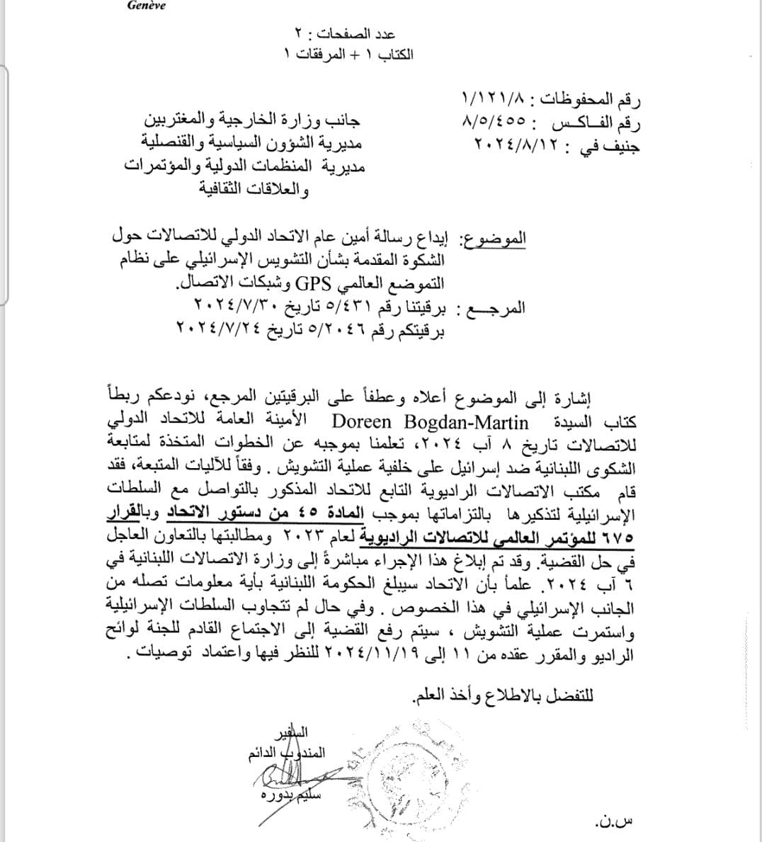وأفاد الكتاب بأن الاتحاد قام بتبليغ وزارة الاتصالات هذا الإجراء، كما سيبلّغ الحكومة اللبنانية بأية معلومة قد تصله من الجانب الإسرائيلي.