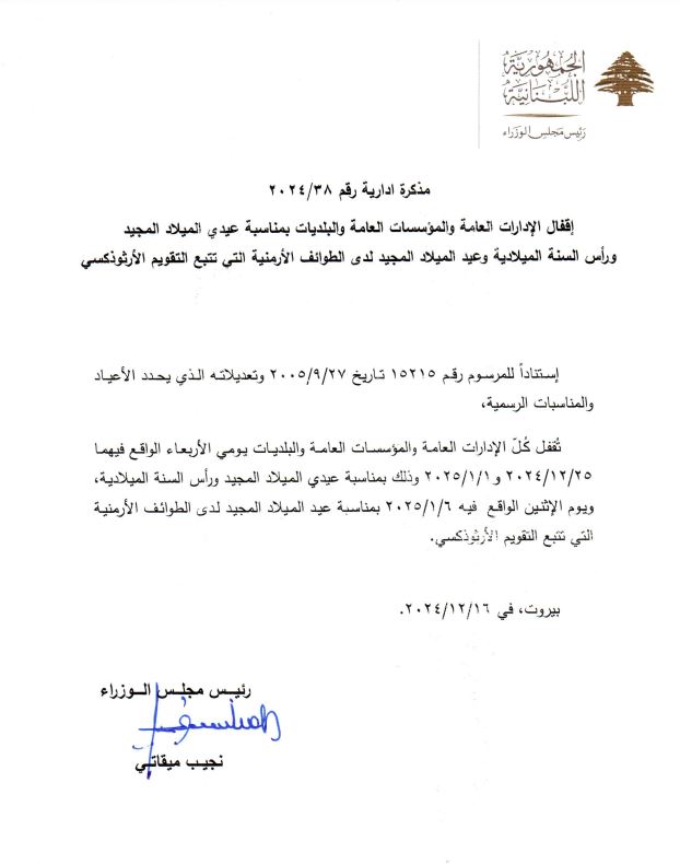 الاحداث - أصدر رئيس حكومة تصريف الأعمال نجيب ميقاتي مذكرة إدارية بإقفال الإدارات والمؤسسات العامة والبلديات لمناسبة عيدي الميلاد ورأس السنة.