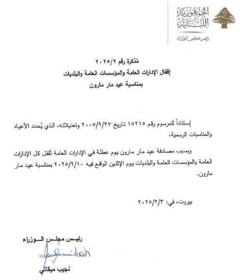 الاحداث - صدر عن رئاسة مجلس الوزراء مذكرة لإقفال الإدارات والمؤسسات العامة والبلديات بمناسبة عيد مار مارون يوم الإثنين الواقع فيه 10/02/2025.