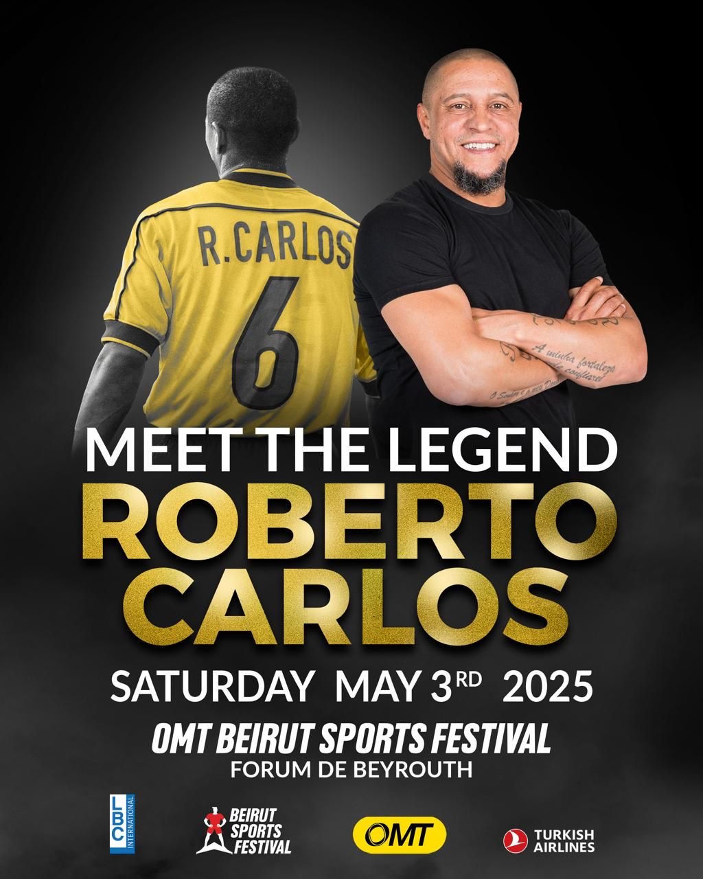 أمّا لعشّاق كرة القدم، فأنتم على موعد مع مشاركة استثنائية خاصّة للأسطورة البرازيلية Roberto Carlos يوم السبت 3 أيّار، حيث سيُشعل حضوره الحماس بين المشاركين ويترك لمسة مميّزة على النسخة الثالثة من OMT Beirut Sports Festival.